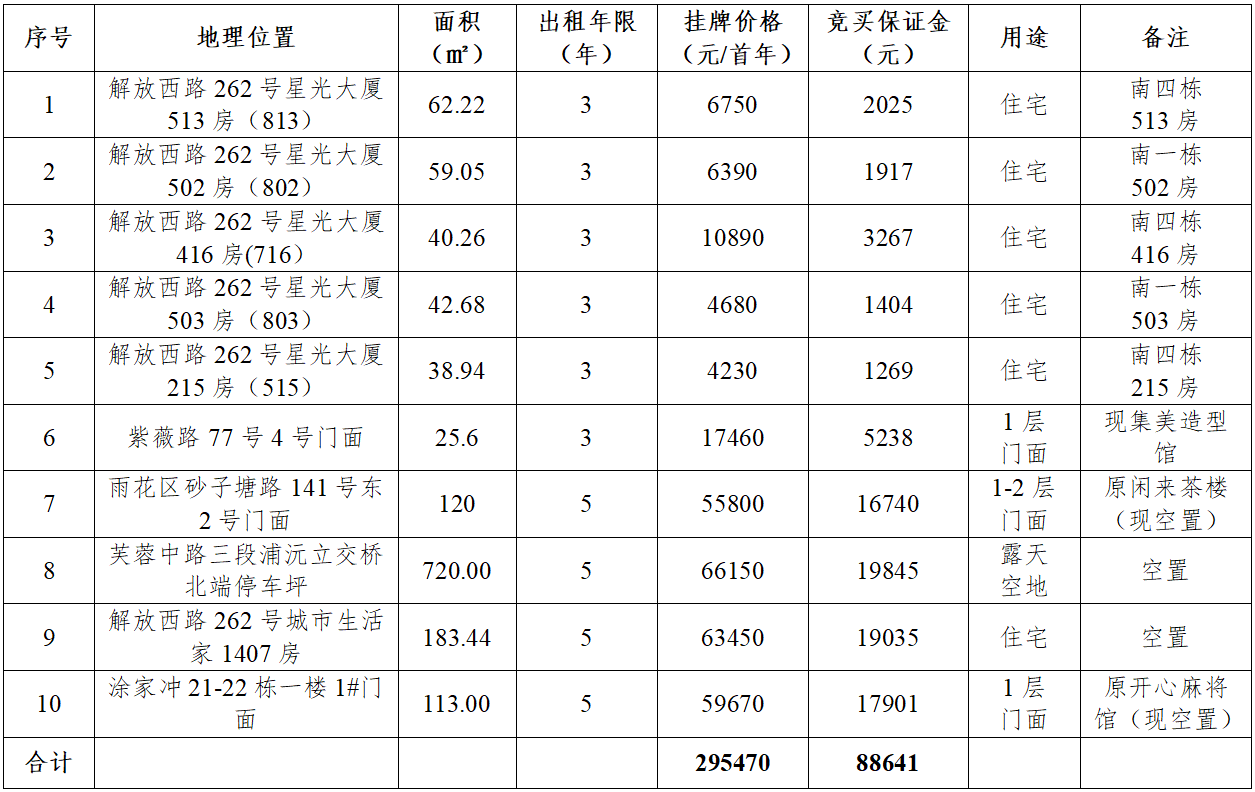 標(biāo)的位于長沙市解放西路、砂子塘路、湘府西路等42處經(jīng)營性資產(chǎn),本次剩余10處標(biāo)的進(jìn)行租賃權(quán)拍賣,現(xiàn)狀為標(biāo)的6存在原租戶(占用中未搬離),無優(yōu)先承租權(quán),其余均為空置門面招租。